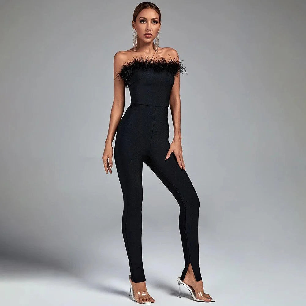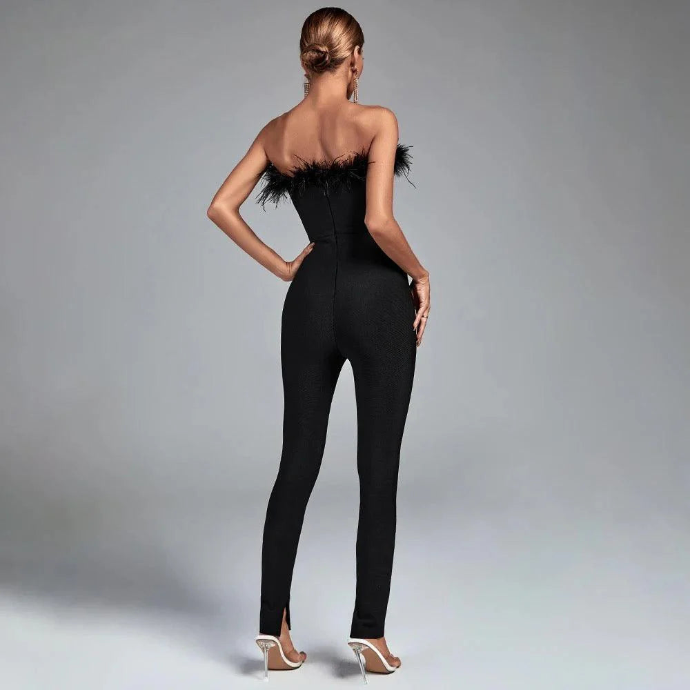 Expertly crafted for maximum comfort and style, our Feather Jumpsuit features a bandage design and delicate feather accents. Perfect for any occasion, this jumpsuit will make you feel confident and fashionable. Elevate your wardrobe with this unique and chic piece.